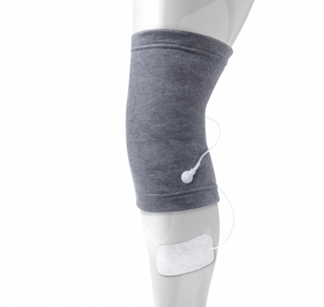 Kolenčnik z vgrajenimi elektrodami za učinkovito lajšanje bolečin v kolenu in hitrejšo rehabilitacijo po poškodbah in operacijah kolena. Poveže se s TENS napravo in se uporablja namesto standardnih elektrod. Namestitev na koleno z "ježki".
